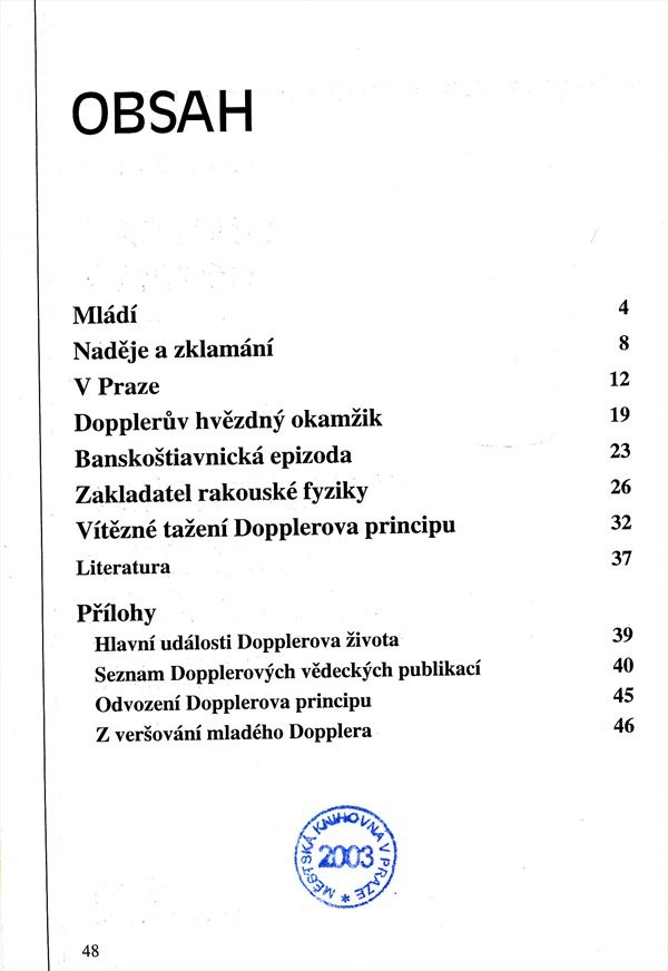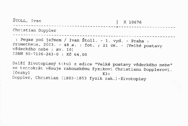 Životopis rakouského fyzika, matematika a astronoma (1803-1853), profesora techniky v Praze, později ve Vídni. Autor se věnuje zejména Dopplerovým objevům v oblasti optiky a akustiky a stručně vysvětluje Dopplerův největší a nejznámější objev, tzv. Dopplerův princip (změna pozorovaného kmitočtu akustických a elektromagnetických vln vlivem vzájemného pohybu zdroje a příjemce). Souběžně s Dopplerovou vědeckou prací autor popisuje i jeho osobní život a téměř celoživotní zápas s materiálním nedostatkem. - Doplněno stručnou chronologií Dopplerova života, výčtem jeho vědeckých prací a na závěr i jeho verši.